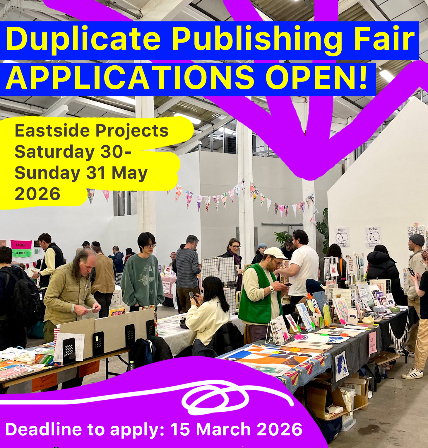 Duplicate Publishing Fair 2025 and will be held at Eastside Projects on Saturday 30th and Sunday 31st (12-5pm) of May. Free to attend. Click here for more info.