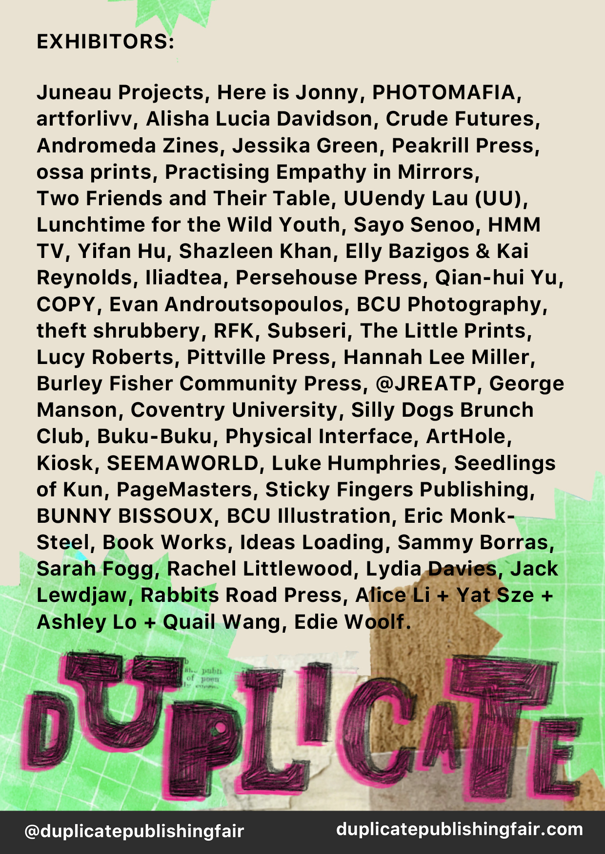 Duplicate Publishing Fair 2025 and will be held at Eastside Projects on Friday 2nd (4-8pm) and Saturday 3rd (12-5pm) of May. Free to attend. Click here for more info.